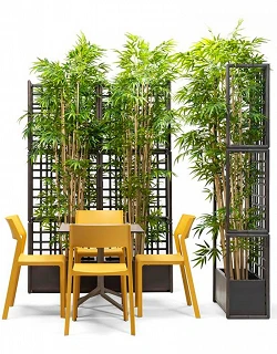 Panel modular autoportante de exterior, configurable a placer, ideal para dividir espacios al aire libre. Compuesto por 3 elementos enrejados fáciles de enganchar entre sí, sin utilizar tornillos y una maceta de autorriego para plantas. Los módulos pueden apilarse verticalmente a una altura máxima de 3 elementos. Para asegurar la estabilidad del producto, el maceta debe llenarse con tierra. MATERIAL: polipropileno fiberglass regenerado tratado anti-UV y teñido en masa. Efecto mate. Resina reciclable.